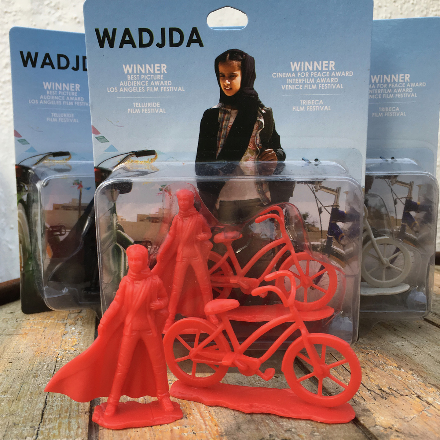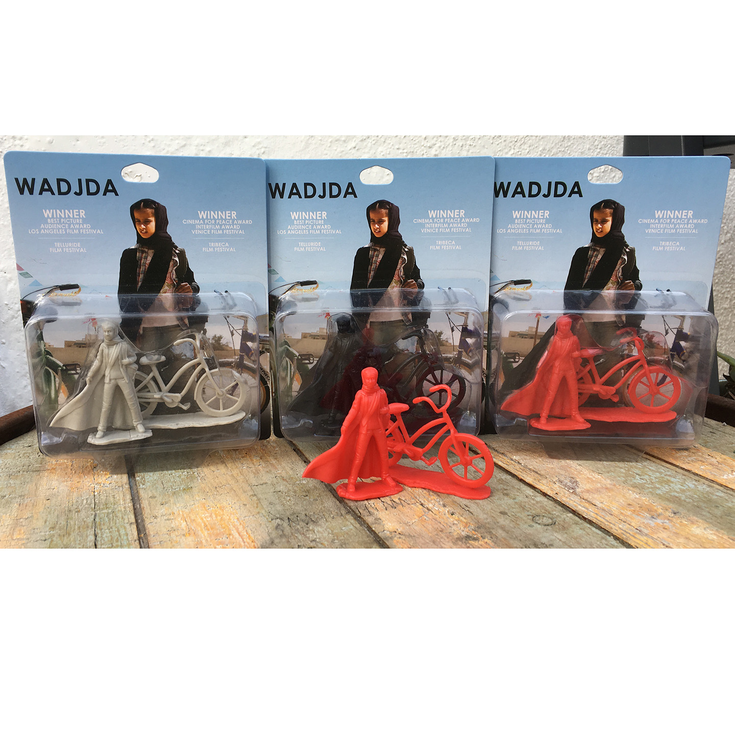 A full set of all 3 color variants of the Exclusive Wadjda figure with her bike!